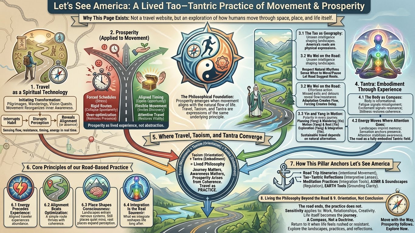 Let’s See America provides the lens through which travel becomes more than transportation — it becomes a lived Tao–Tantric practice.