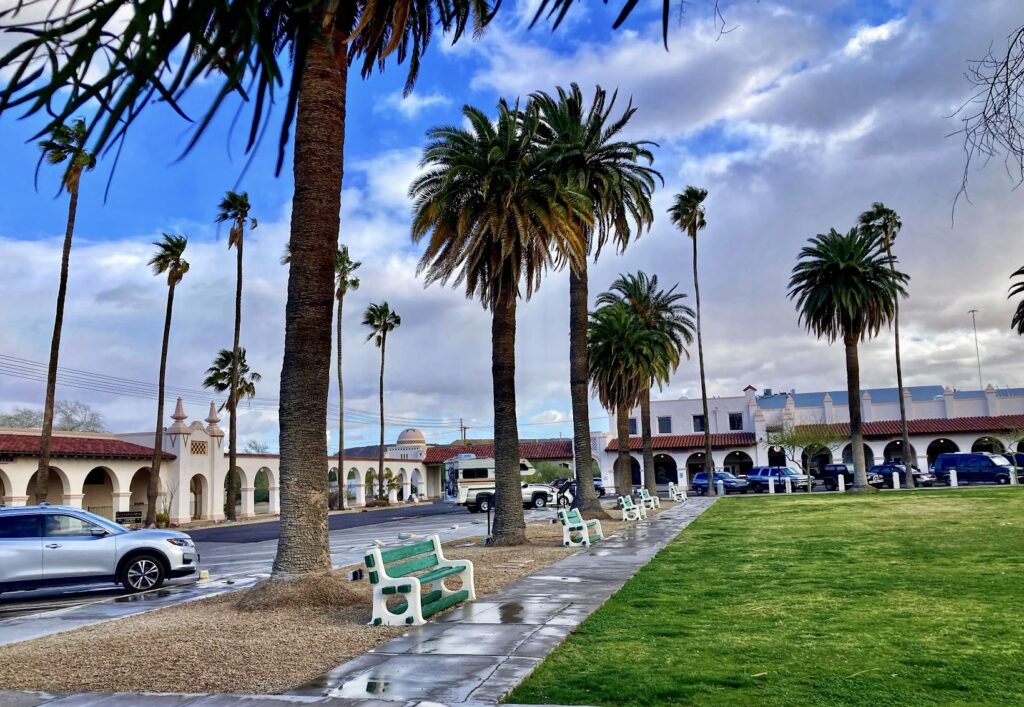 As I approached the downtown area or The Plaza, I was quite taken by the Spanish-style buildings surrounding an oasis. This inviting area was complete with tall palm trees, plenty of green grass, park benches, and even a beautiful white stucco bandstand. Next, time for a stroll!