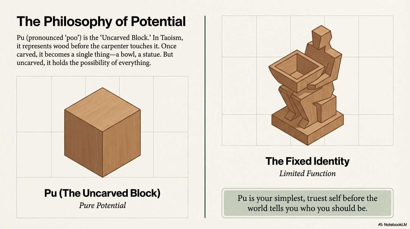 Translated as “The Uncarved Block,” Pu imagines a pristine piece of wood before a carpenter’s tools shape it. Its power lies in its pure potential. Once carved, it becomes one thing—a bowl, a statue. But uncarved, it holds the possibility of everything.