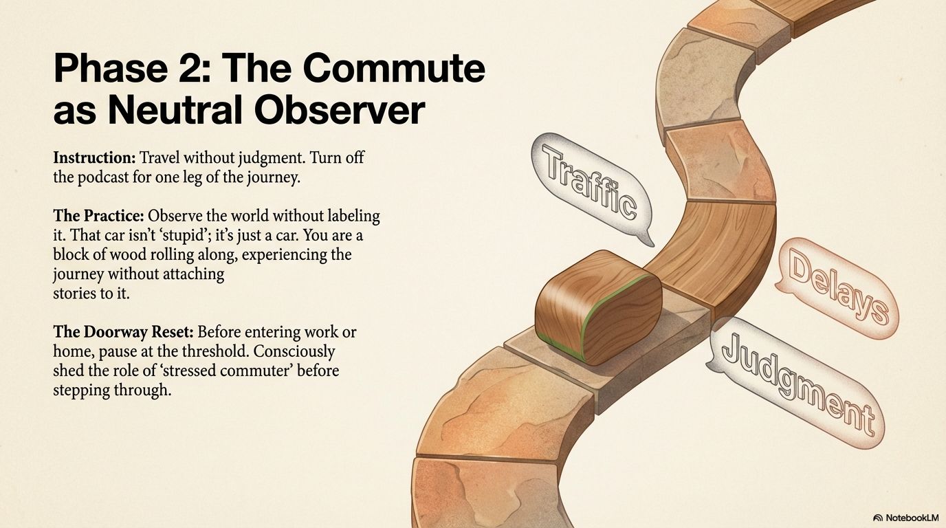 - Drive or Walk in Silence: For one leg of your journey, turn everything off. Don’t “use” the time. Let the world pass by without labeling it (“stupid traffic,” “slow walker”). Just observe. You are a block of wood rolling along, experiencing the journey without judgment.