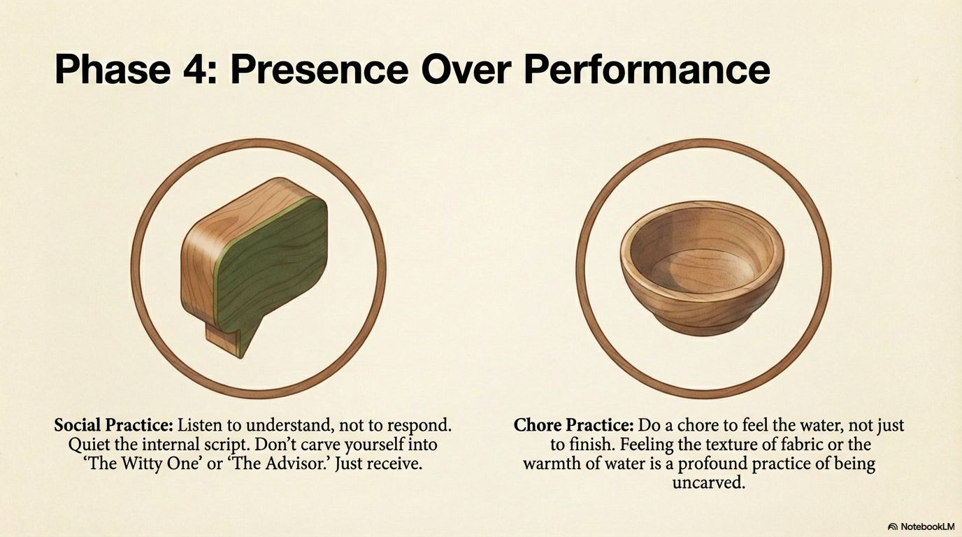 - Single-Task as a Ritual: For one small task, give it your full, quiet attention. When filing a report or making a coffee, just do that. When your ego wants to shout “I’m so busy!” or “This is beneath me,” recognize that as a “carving.” Return to the simple, uncarved act itself.