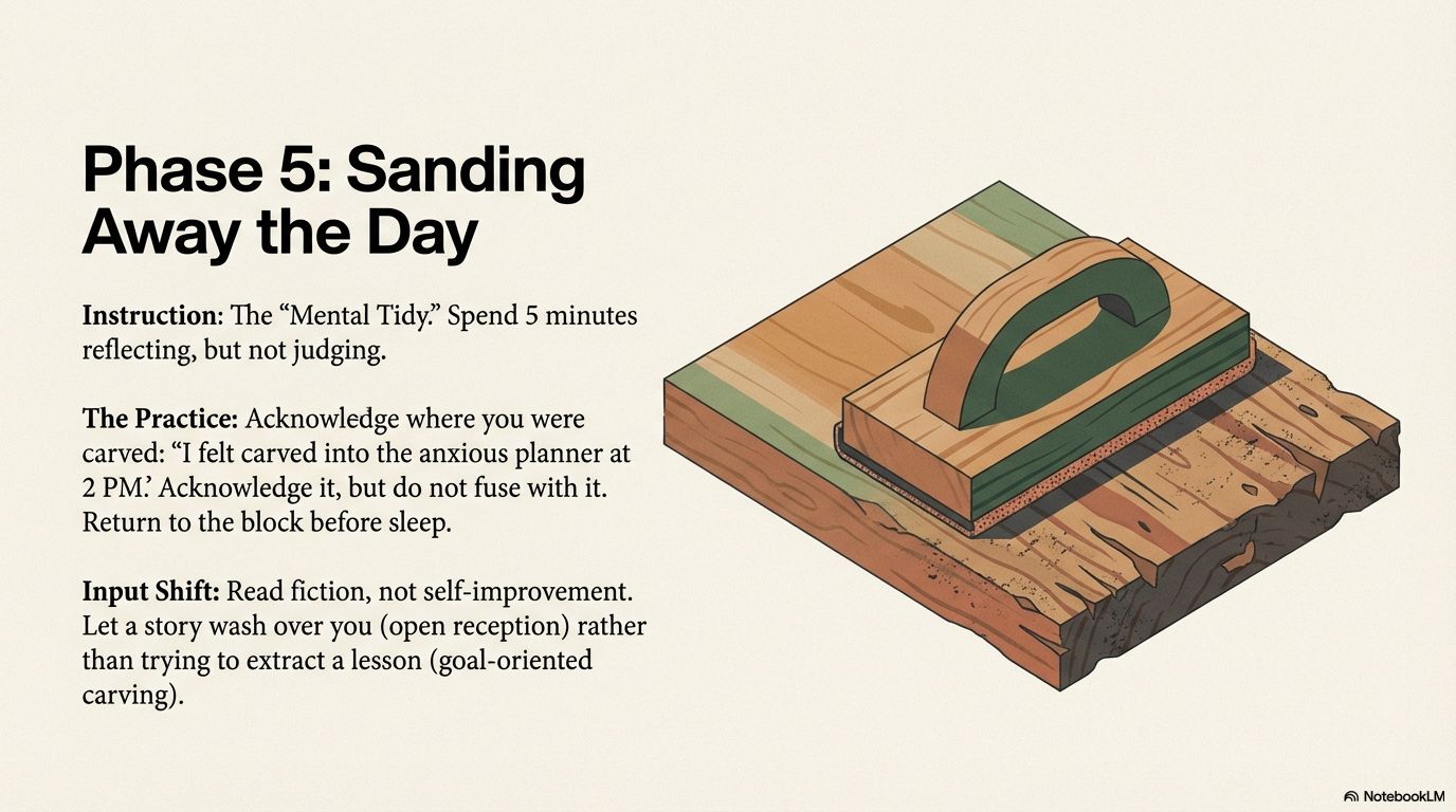 - Read Fiction, Not Self-Improvement: Let a story wash over you without trying to extract a lesson. This allows your mind to exist in a state of open reception (Pu) rather than goal-oriented carving.