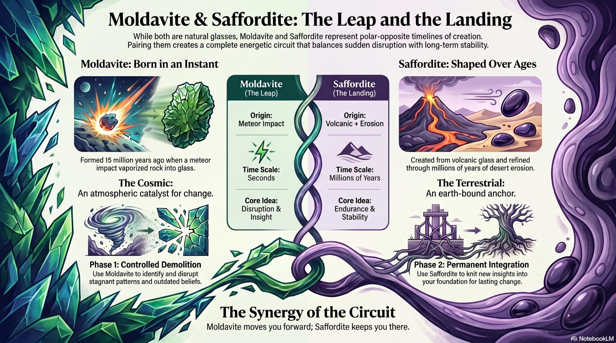 To create a balanced spiritual practice, one must manage the interplay between expansion and stability. Using a high-frequency tektite like Moldavite alongside a grounded “pseudotektite” like Saffordite creates a complete energetic circuit, allowing for growth without losing one’s center.
