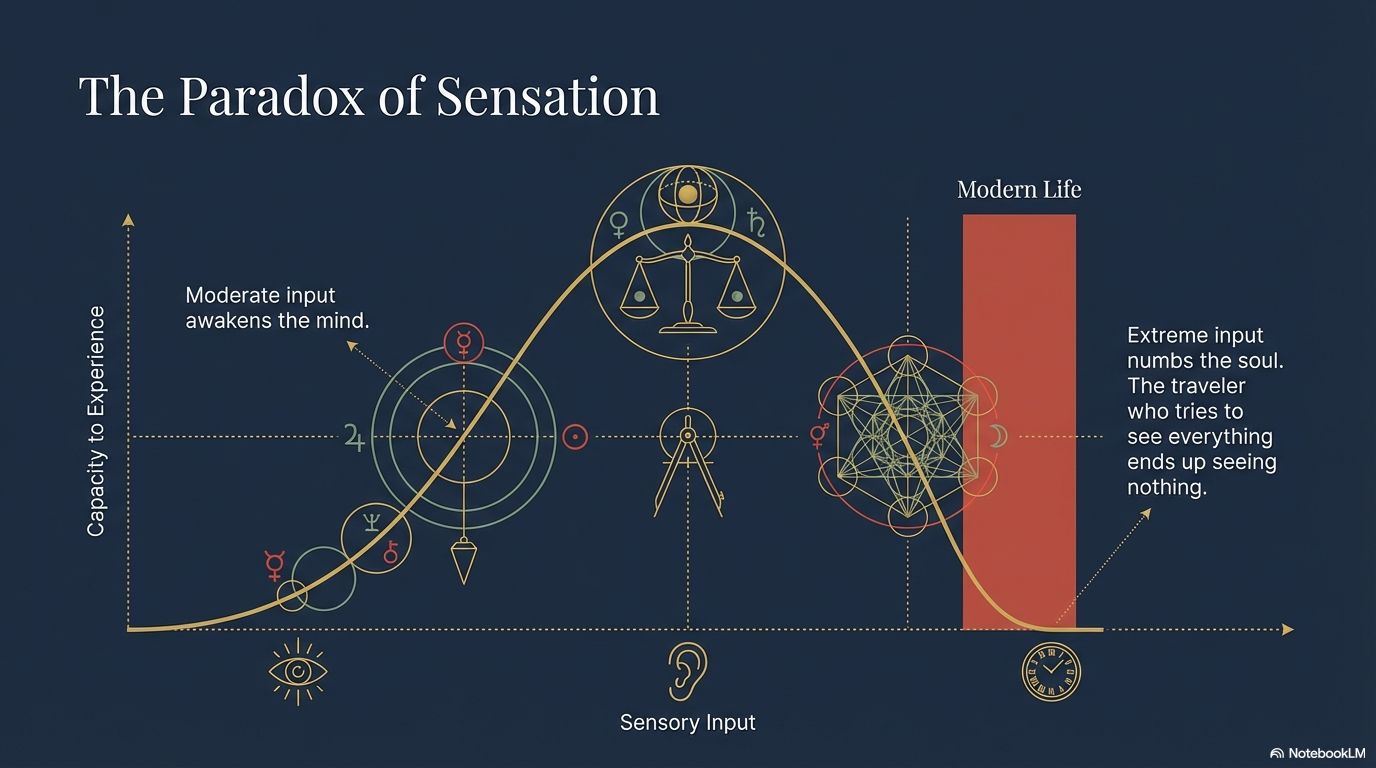 When we flood our senses with constant input—endless images, noise, flavors, thrills, and the pursuit of rare or exclusive experiences—we lose the ability to perceive anything deeply. Excess doesn’t heighten awareness; it erodes it.