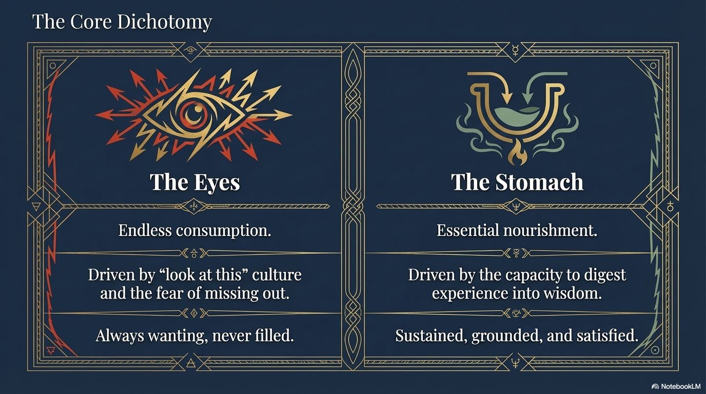 This is not a rejection of beauty or enjoyment. It is a prioritization of what truly nourishes over what merely stimulates. The stomach represents what sustains—the essential, the foundational, the truly needful. The eyes represent the endless parade of desires, the “look at this” culture that keeps us always wanting but never satisfied.