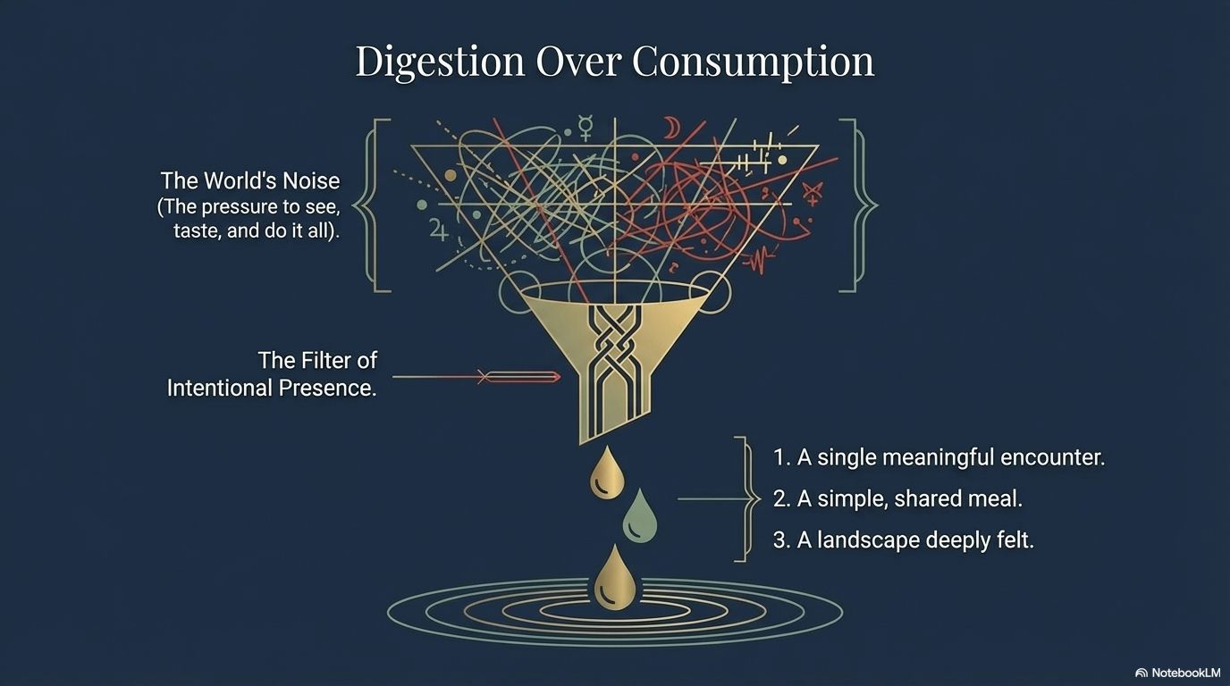 The Traveler’s Insight: Have you ever returned from a trip with a thousand photos but no memory of actually being anywhere? You saw so much that you saw nothing. The eyes became cameras, not organs of presence.