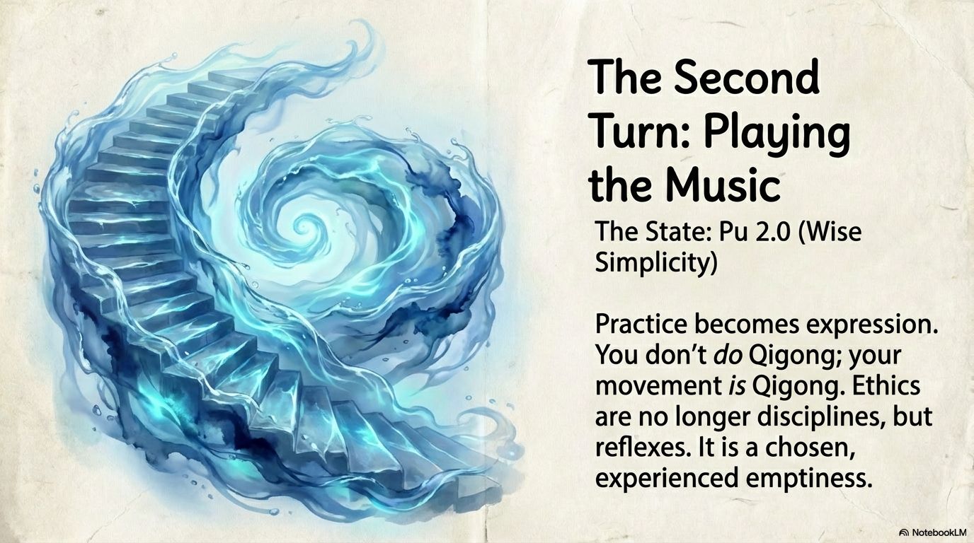 In Taoist philosophy, true development follows a spiral, not a straight line. Authentic power (De) culminates not in finality but in a conscious return to Pu—wise simplicity.