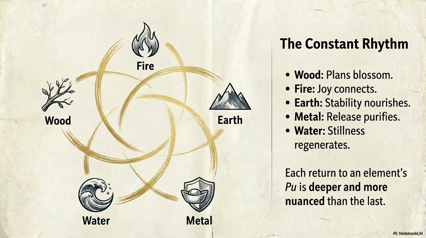 Even as you spiral upward, the 5 Elements remain your constant, grounding touchstone. Each return to Pu happens within their rhythm.