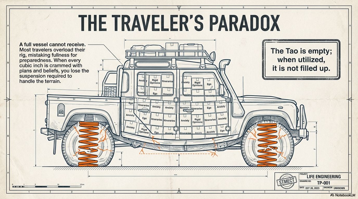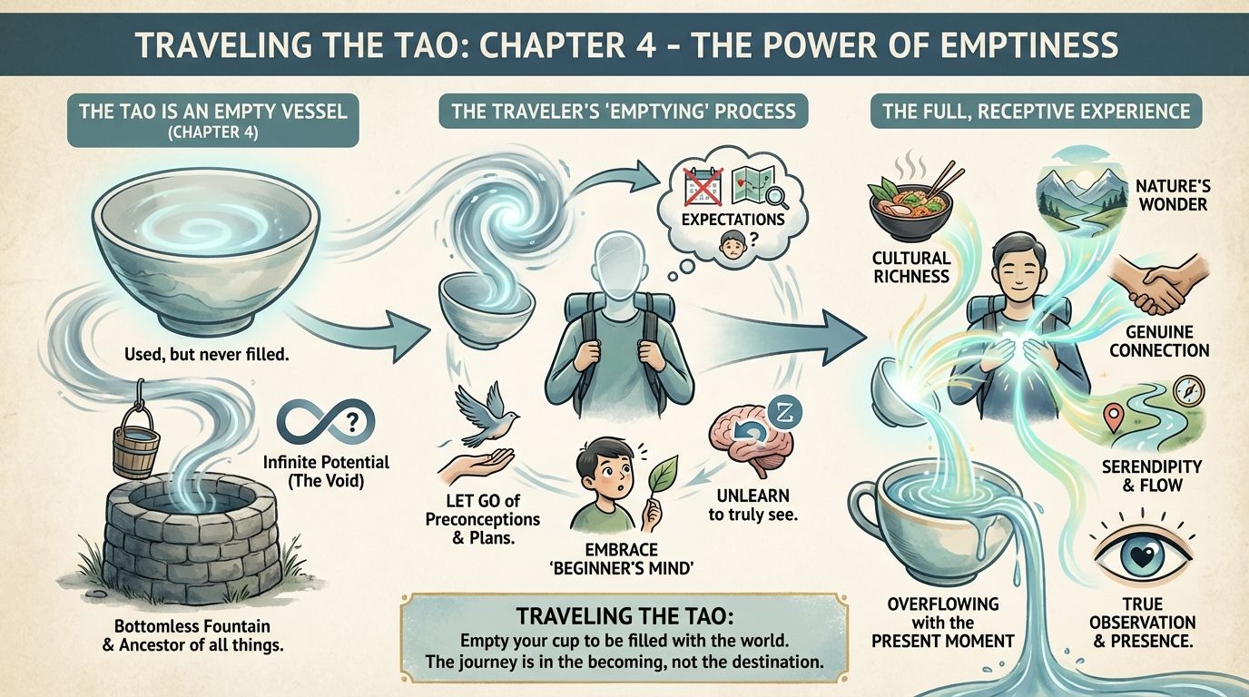 A seasoned traveler knows the value of empty space. It’s the hollow trunk that holds the gear, the quiet moment between destinations that holds the memory, and the unknown detour that holds the adventure. Tao Te Ching Chapter 4 reveals that the most essential tool for your journey isn’t something you pack—it’s the spacious, adaptable emptiness you cultivate within.