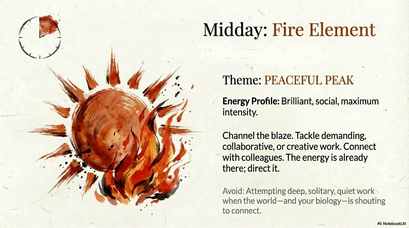 2. Midday (Fire Element) – Wu Wei as PEACEFUL PEAK, Not Burnout