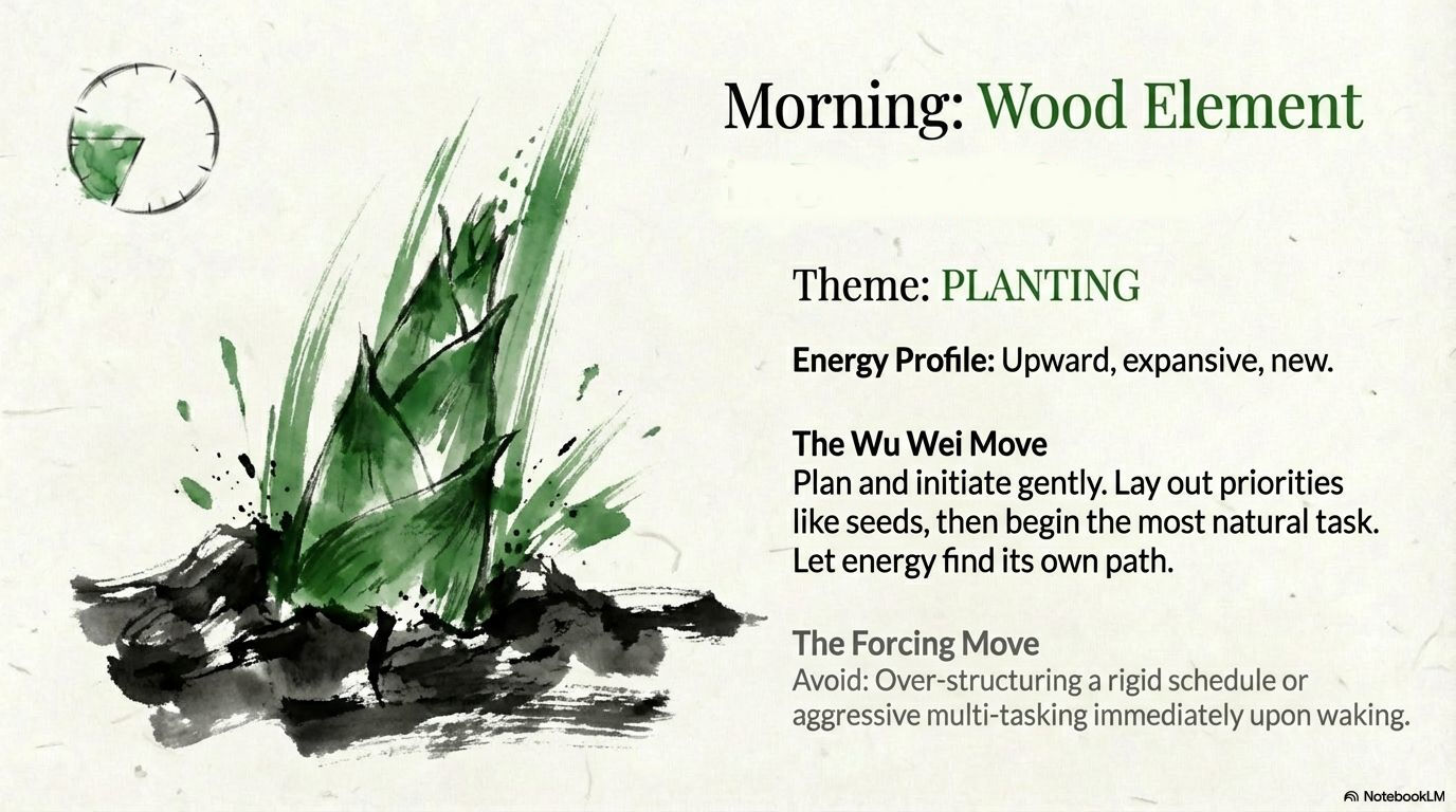1. Morning (Wood Element) – Wu Wei as PLANTING, Not Pushing