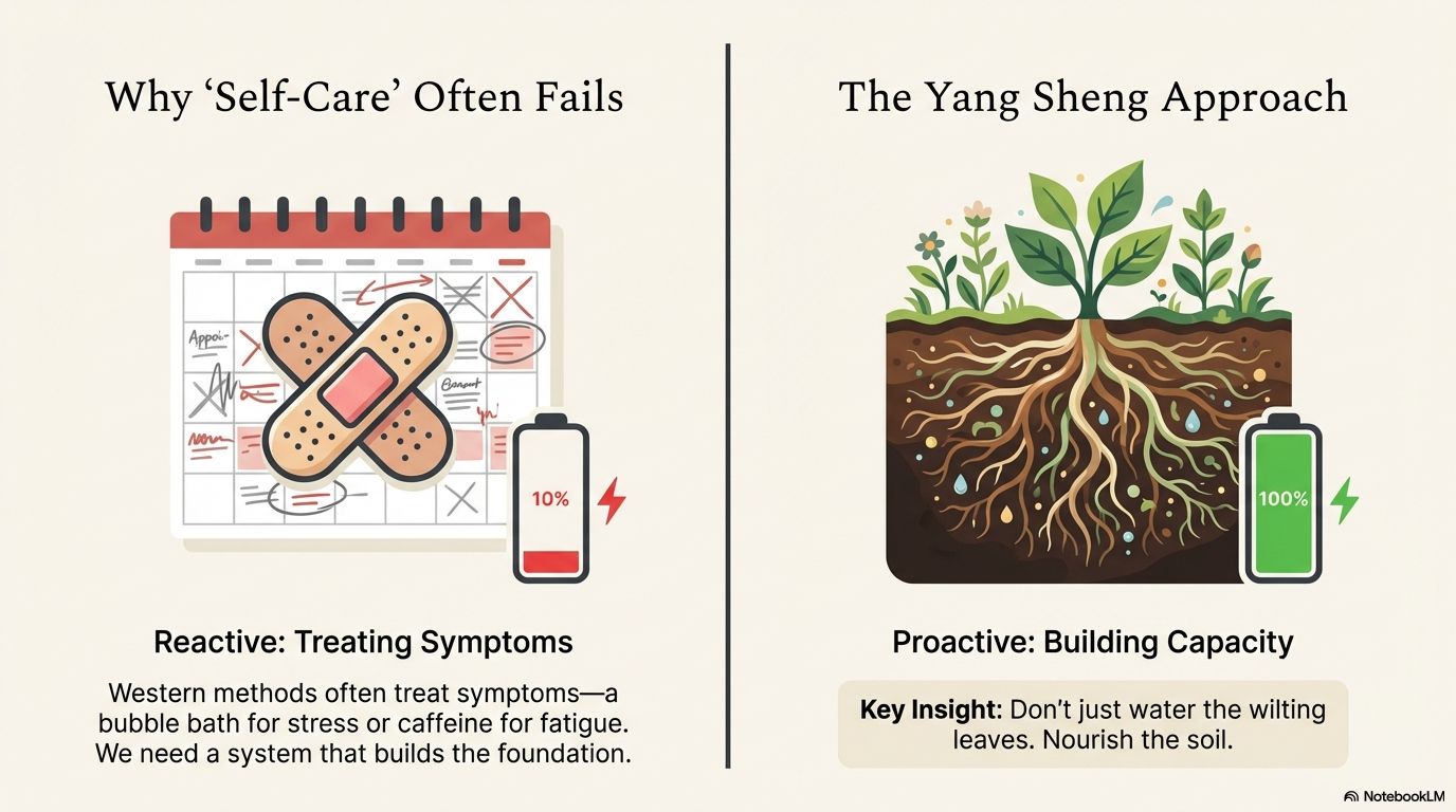 What if the problem isn’t you, but the model? Western self-care often treats symptoms: a bubble bath for stress, a green juice for fatigue. It’s reactive and piecemeal.