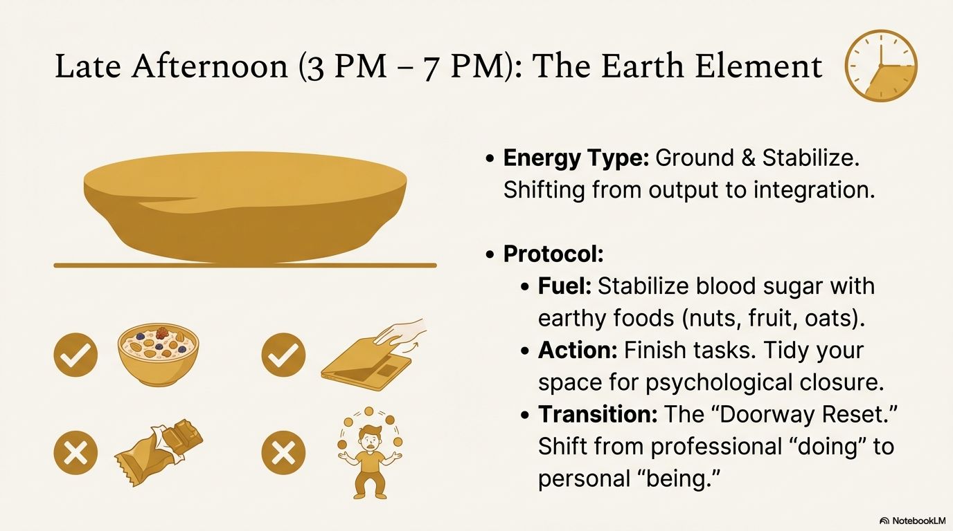 3. Late Afternoon (3-7 PM) – EARTH Element: Ground and Digest