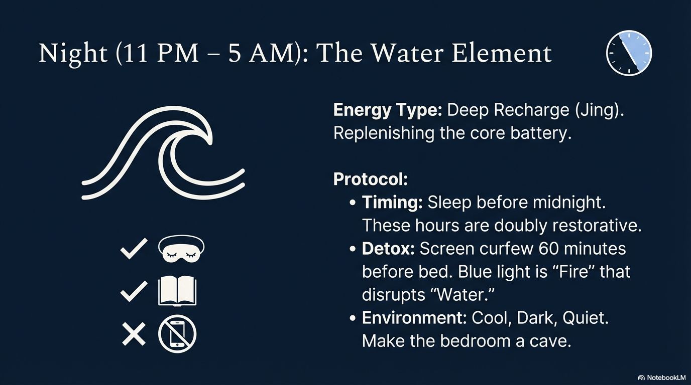 The Goal: Maximize your body’s profound restoration cycle. This is when your foundational energy reserve (Jing) is replenished.