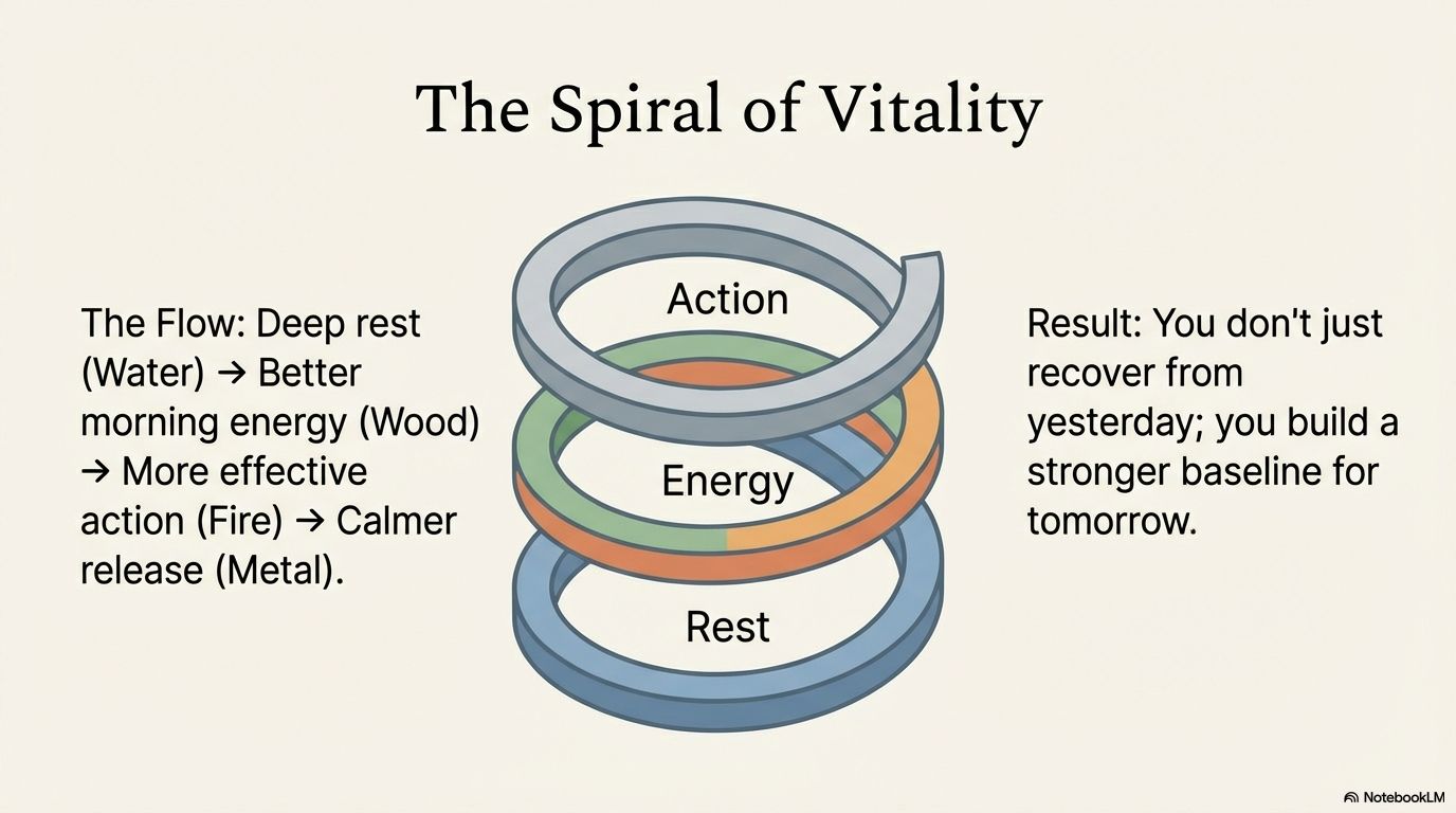 - Morning (Wood): You wake with that energy, using it to plan and grow (Qi) without force.